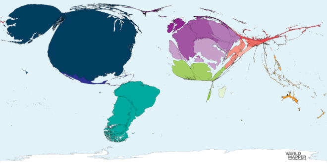 The maps show each country resized according to the number of athletes participating from each country (with the Olympic Athletes from Russia shown as Russia). Olympic games are still an event that is largely influenced by wealth of participating nations. As the following cartogram of the number of participants shows, the most affluent countries are those that send most athletes to the games – with a slight bias towards classic ‘winter sports’-countries
